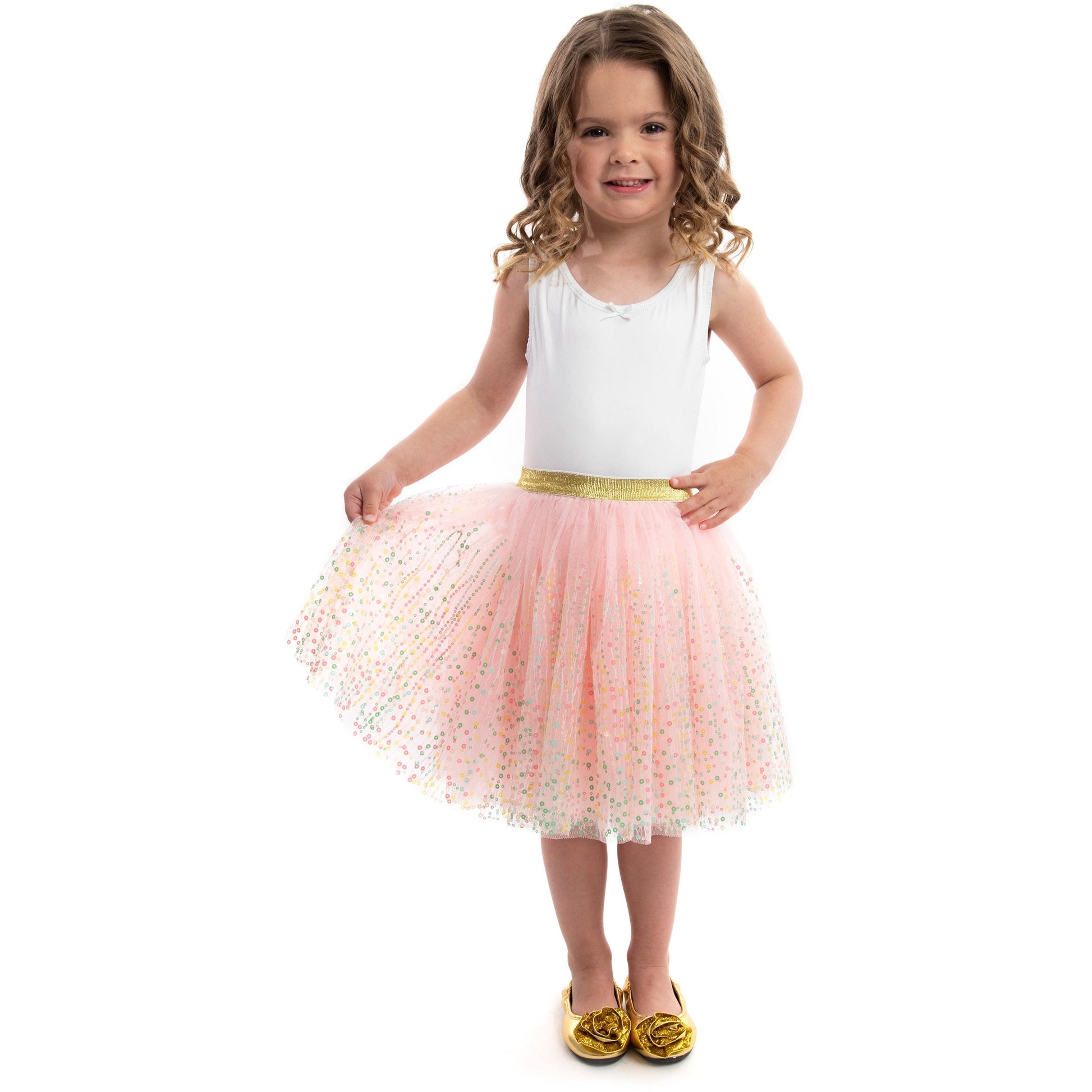 - Made with three layers of pink soft tulle that with a knit underskirt and decorated with colorful sequins