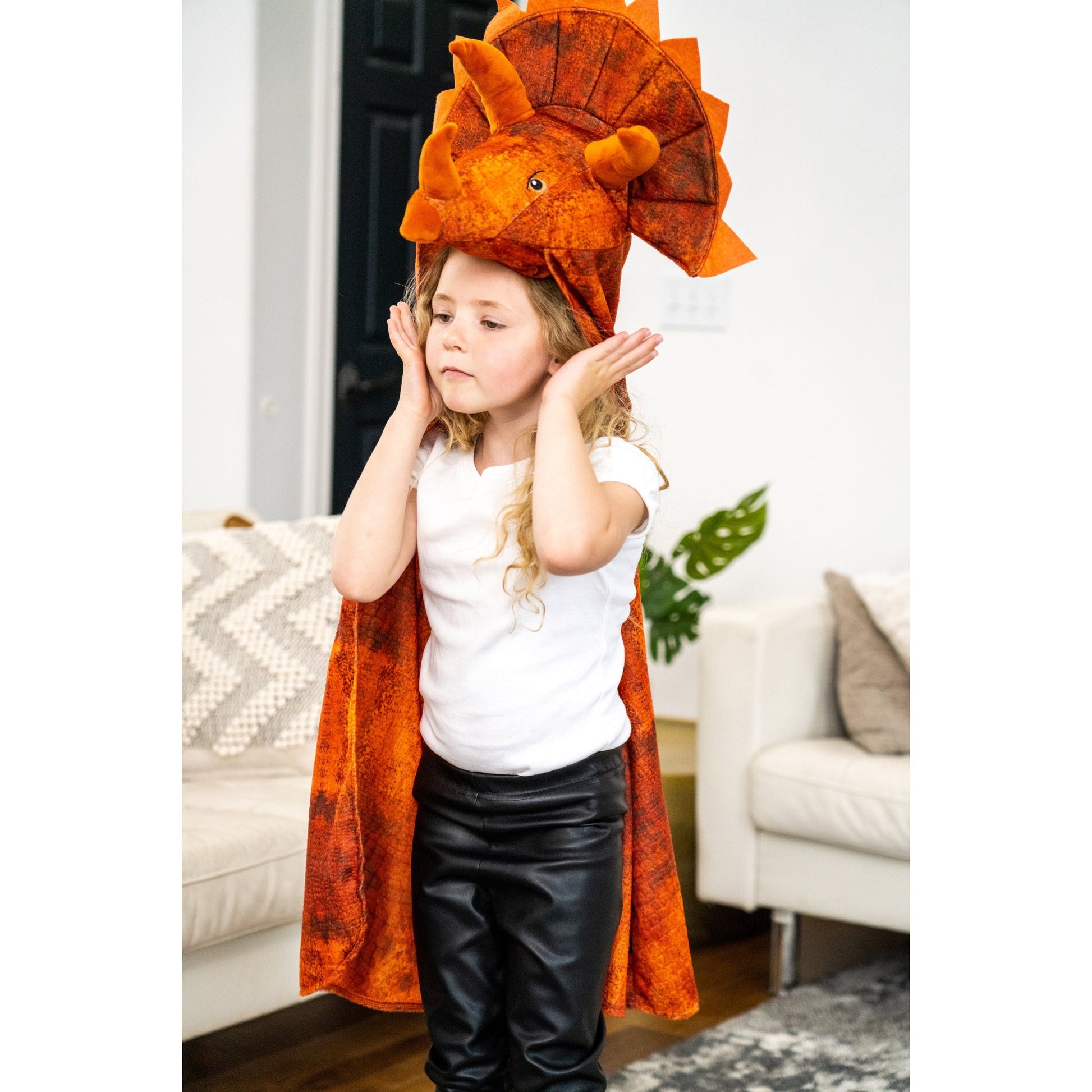 - Embossed orange dinosaur scale print cloak with a stuffed Triceratops hood