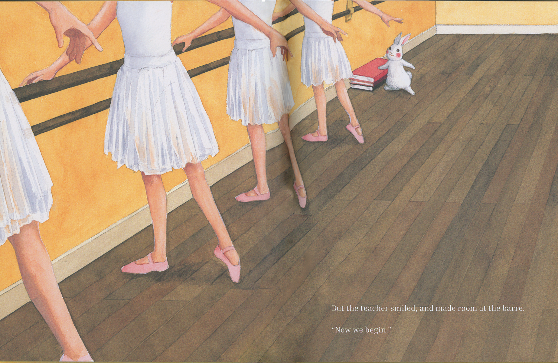 One night, a white rabbit glimpses a ballet class in progress and is enchanted. She gathers her courage and asks if she may join the class. Soon, other friends join too, and learn – along with classical ballet – that being true to yourself can be beautiful. A heartwarming story about having the courage to step into unknown worlds.