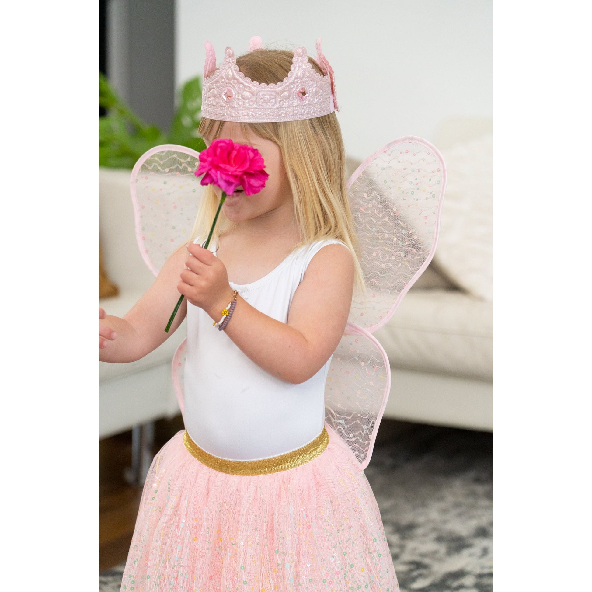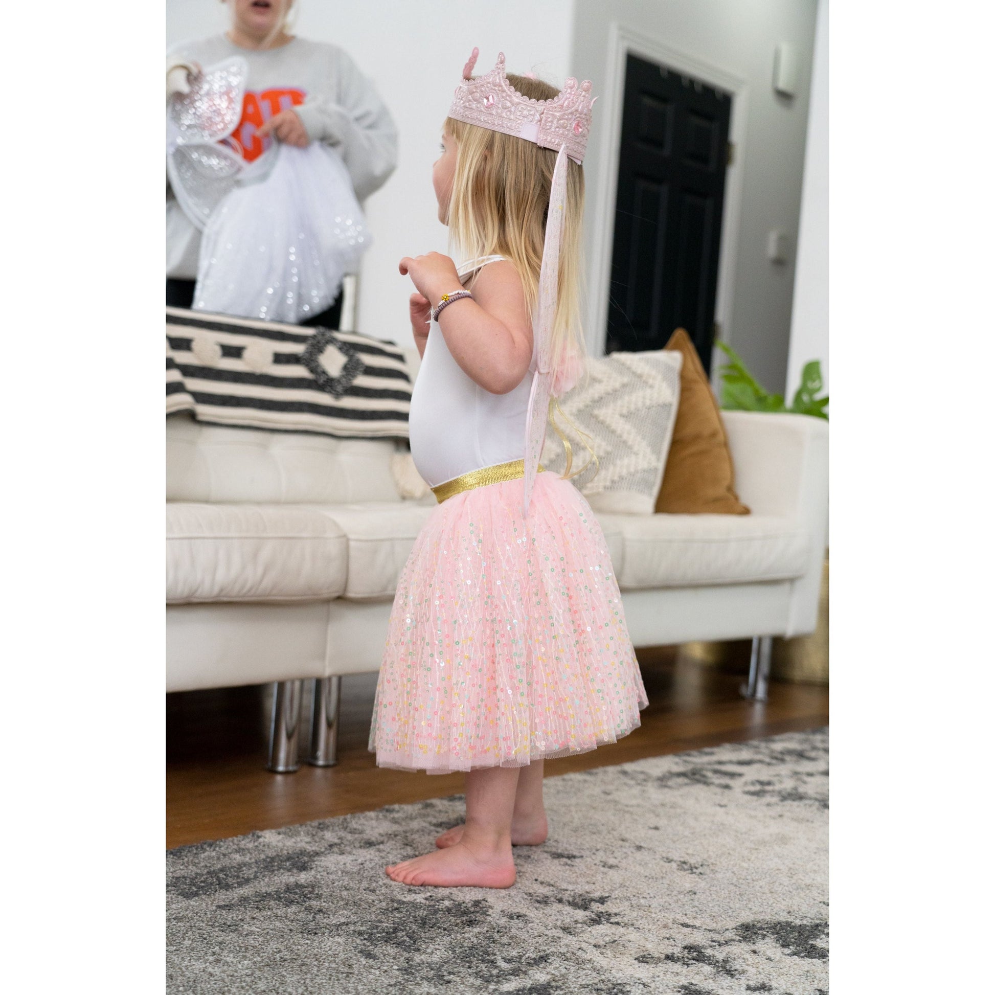 This tutu is perfect for twirling, jumping, and dancing with its irresistible soft and shimmery pink fabric.